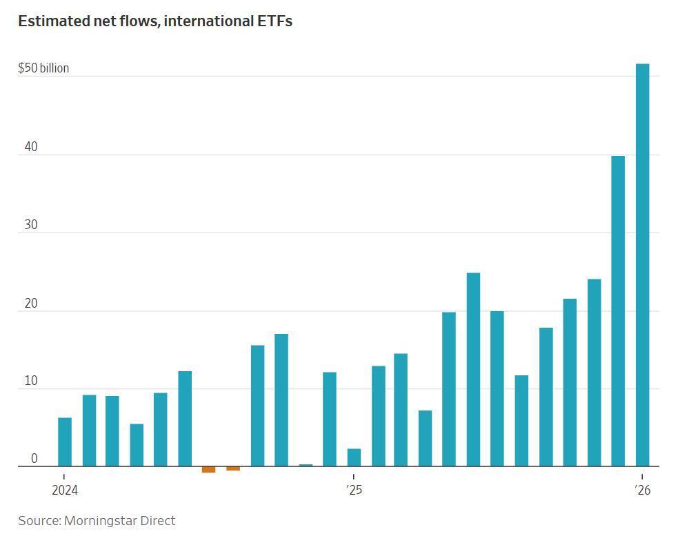 这一海外配置趋势正在加速。晨星公司(Morningstar Direct)数据显示,1月投资者向国际股票交易所交易基金净流入516亿美元。自2024年底以来,月度资金流入量大幅跃升。