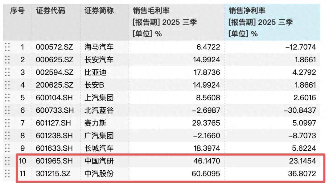 利润差距的核心的是毛利率的天壤之别。Wind数据显示,2025年前三季度,多数车企销售毛利率不足20%,而中国汽研和中汽股份分别达到46.15%和60.61%。