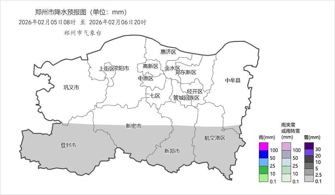 图1 2026年2月5日08时至6日20时郑州市降水量预报图
