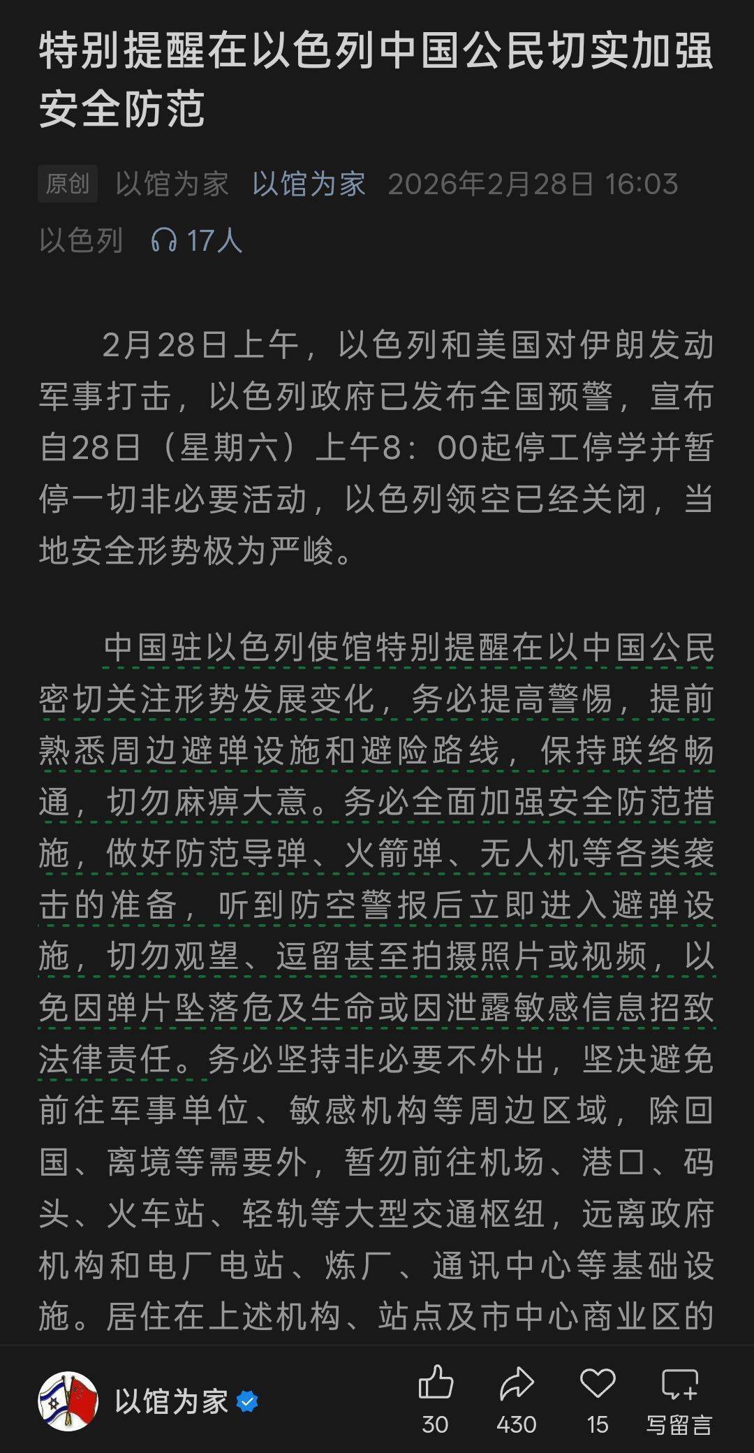 中国驻以色列使馆特别提醒在以中国公民密切关注形势发展变化,务必提高警惕,提前熟悉周边避弹设施和避险路线,保持联络畅通,切勿麻痹大意。务必全面加强安全防范措施,做好防范导弹、火箭弹、无人机等各类袭击的准备,听到防空警报后立即进入避弹设施,切勿观望、逗留甚至拍摄照片或视频,以免因弹片坠落危及生命或因泄露敏感信息招致法律责任。务必坚持非必要不外出,坚决避免前往军事单位、敏感机构等周边区域,除回国、离境等需要外,暂勿前往机场、港口、码头、火车站、轻轨等大型交通枢纽,远离政府机构和电厂电站、炼厂、通讯中心等基础设施。居住在上述机构、站点及市中心商业区的人员建议尽快寻找其他安全居所。如遇紧急情况,请及时报警并与中国驻以色列使馆取得联系。