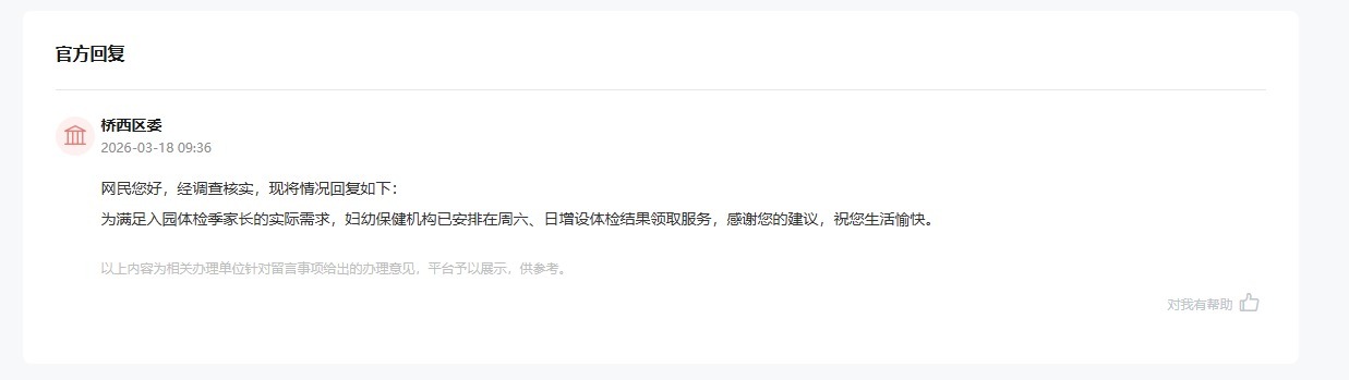 收到留言后,石家庄市桥西区委高度重视,经调查核实后回复:为满足入园体检季家长的实际需求,自3月14日开始,桥西区妇幼保健机构已安排在周六、日常态化开设领取窗口。