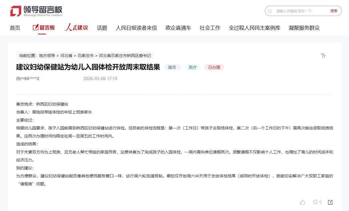 该网民的孩子今年春天准备入园。按幼儿园要求,入园前需到桥西区妇幼保健站体检,流程为:第一次需在工作日带孩子现场体检,第二次需在另一个工作日的下午领取纸质结果。对于独自带娃的双职工家庭而言,一周请两次假不仅影响个人工作,也增加了育儿的时间成本和经济压力。他在留言中建议:“能否像其他便民服务窗口一样,试行周六轮流值班制。哪怕仅开放周六半天用于发放体检结果,就能解决双职工家庭的‘请假难’。”