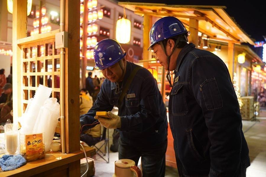 美食摊位前市民游客已排起了队,热腾腾的羊肉串和牛肉饼刚出炉便被抢购一空,摊主脸上满是笑容。“我这摊位一直是‘人气王’。”摊主说,“灯会游客多了,电蒸炉、电炸锅就得一起开。以前我担心用电问题,现在完全不会了。供电师傅经常提前上门帮着检查。”
